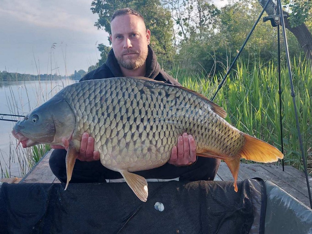 3,6 m-es 2,7 lbs bot, 0.34-es monofil zsinór, 4-es horog. Bojli csali és etetés. Napos, szeles idő, szürkület, 20 perces fárasztás partról.